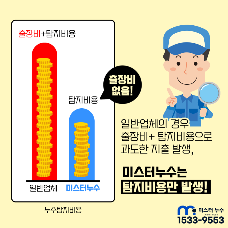 물론 고객님의 심정을 충분히 이해합니다만, 이러한 증상을 방치할 수록 피해의 규모와 범위는 더욱 커집니다. 결국 누수가 발생하는 면적이 넓어질수록 원인을 찾기 위한 누수탐지 비용도 증가할 수밖에 없다. 그러므로 시간과 비용을 절약하기 위해서는 초기에 빠른 대응이 중요하다는 점을 말씀드리고 싶습니다. 이제 상황을 충분히 확인했으니 위층으로 올라가서 공기압을 점검해보겠습니다!