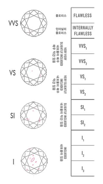 다이아몬드의 투명도가 높아질수록 투명도는 더 가치 있는 것으로 간주될 수 있습니다. 이는 성형 공정의 부산물이며 내포물 및 결함으로 간주될 수 있습니다. 등급은 다음과 같습니다.