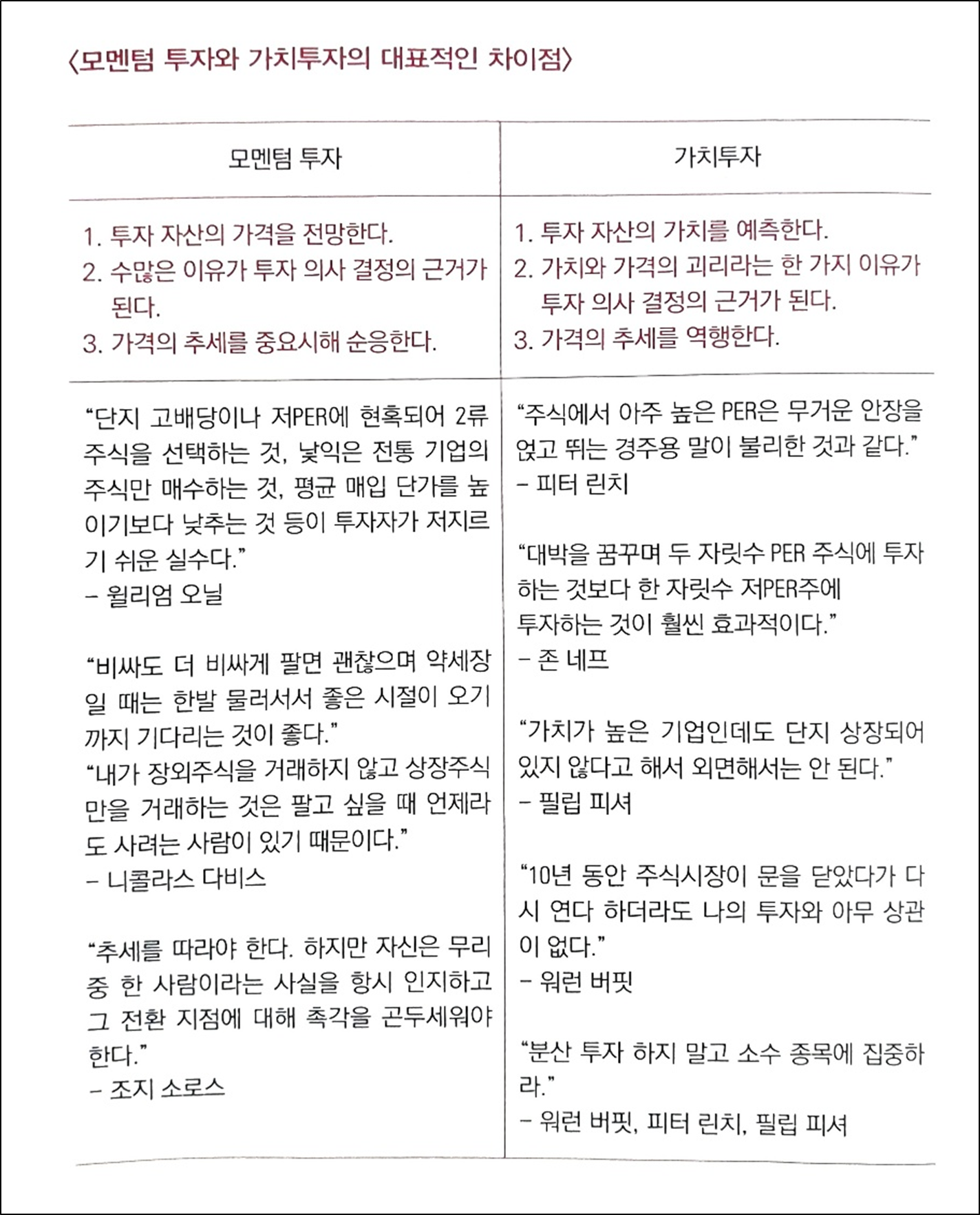 (33P) 모멘텀 투자와 가치 투자는 공존하거나 섞일 수 없다고 생각합니다. 매매 타이밍에 있어서 추세 추종은 모멘텀 투자의 기본 전략이고 추세 역전은 가치 투자의 기본 전략으로 이 두 전략은 상충된다. Jesse Livermore와 같은 모멘텀 투자자는 매수하려는 주식의 가격이 일정 범위를 벗어나면 손절매를 고려하고, Warren Buffett과 같은 가치 투자자는 시작한 주식의 가격이 하락하면 추가 매수를 고려할 것입니다. 계속 구매하려면 아래로 떨어집니다. . 모멘텀 투자자는 일반적으로 투자하기 전에 시장 심리가 개선되기를 기다리고 가치 투자자는 시장이 주식에서 멀어지면 주식을 사기 시작합니다.