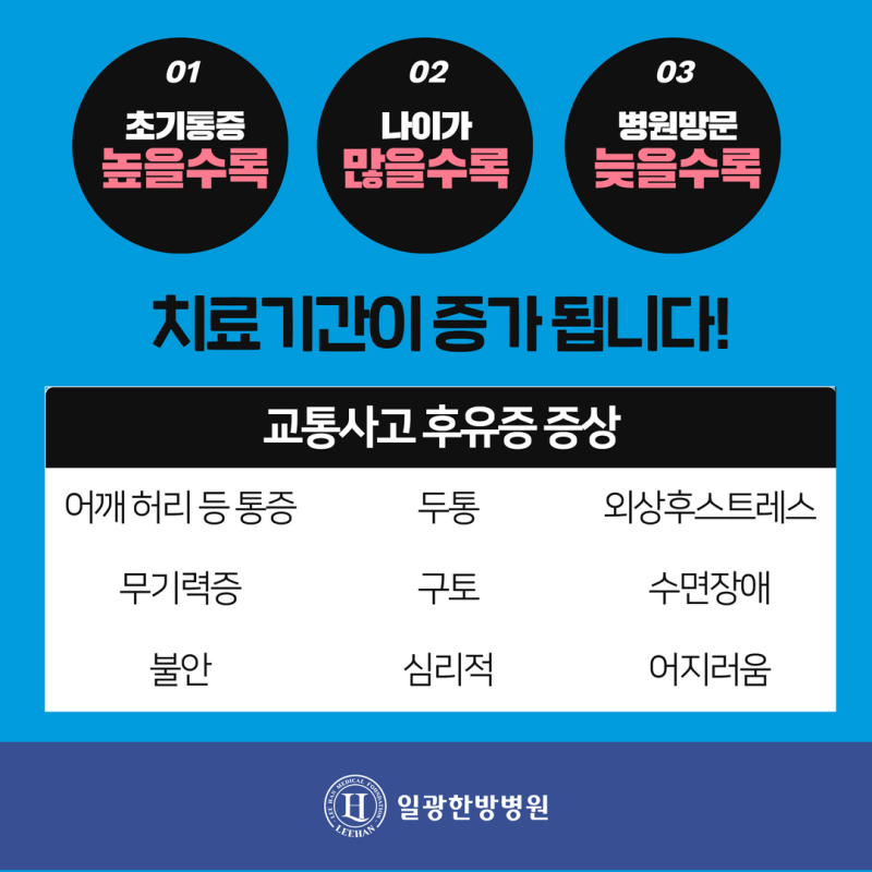 교통사고는 우리가 생각하는 것보다 더 흔합니다. 그러나 사고의 정도에 따라 치료기간과 회복기간이 크게 달라질 수 있습니다. 경미한 사고의 경우에는 간단한 치료만으로도 호전될 수 있지만, 디스크 탈출증이나 내혈전증 등의 척추질환으로 발전하게 되면 원인을 알 수 없는 통증이나 만성통증의 후유증이 나타나게 된다. 대표적으로 목, 어깨, 허리 통증이 가장 흔하지만 손목과 엉덩이 통증, 무릎 통증, 발목 통증과 같은 다른 관절 통증 증상도 매력적일 수 있습니다. 또한 내충격에 의한 출혈은 혈전으로 응축되어 확인이 쉽지 않기 때문에 진료를 받는 것이 좋습니다. ※ 교통사고 후유증 증상