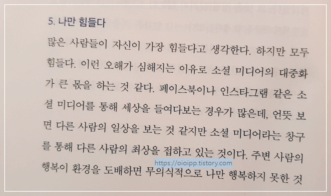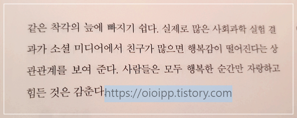 20~21쪽에 있습니다. 나만 힘들다고 생각하는 분들이 많다. 그것은 소셜 미디어에서 친구가 많을수록 행복도가 낮다는 것을 보여줍니다. 사람들은 행복한 순간만 자랑하고 힘든 순간은 숨긴다.