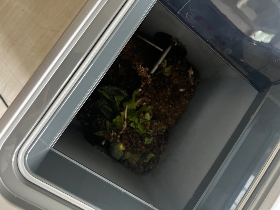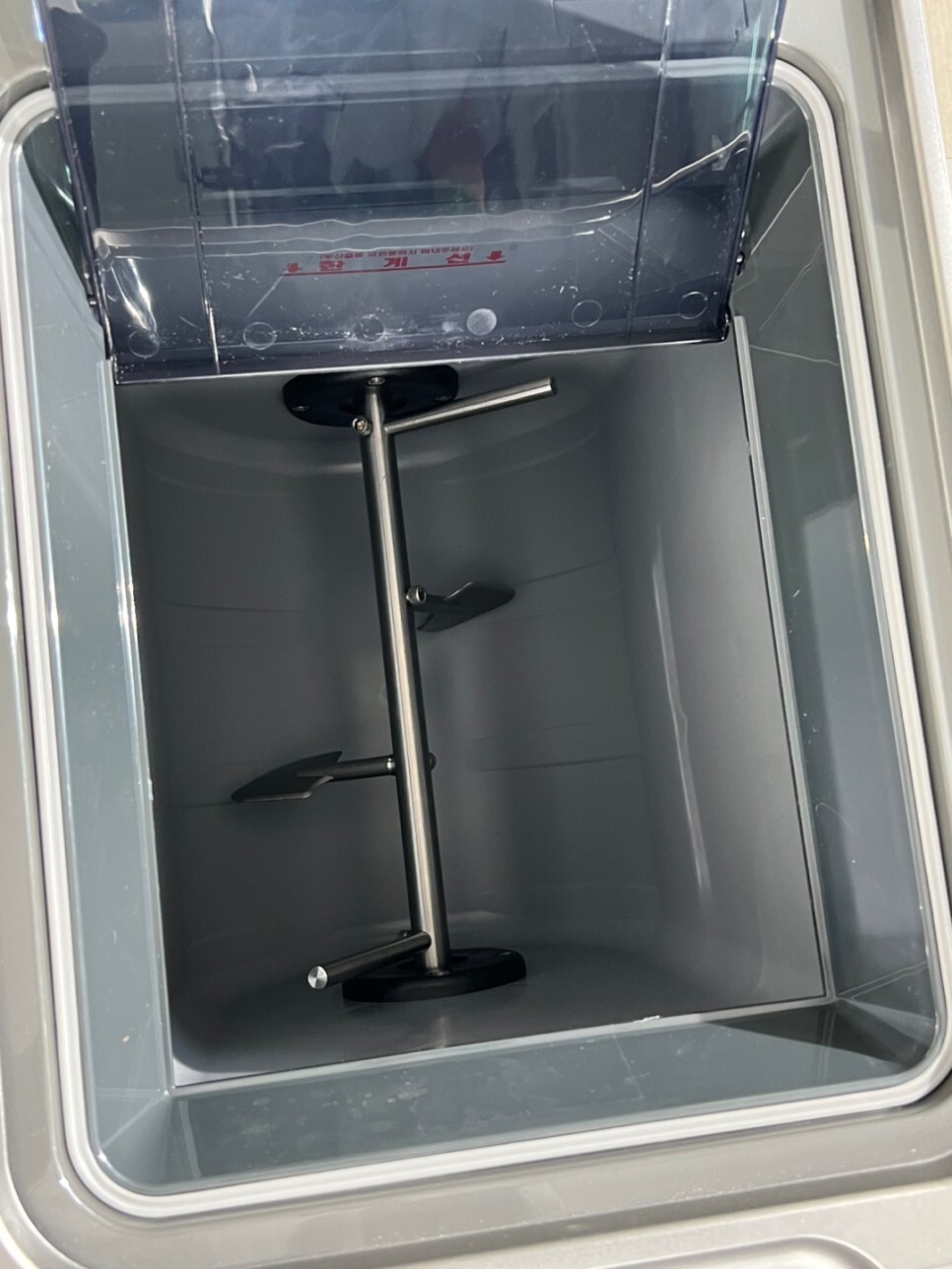 뚜껑을 열면 이렇게 회전하는 막대가 있습니다. 특허받은 미생물 제제를 먼저 넣어주세요. 그런 다음 음식물 쓰레기를 버리십시오. 막대가 회전하면서 음식물 쓰레기와 미생물이 잘 섞이도록 도와줍니다. 삽 모양의 봉도는 효율적으로 섞을 수 있도록 디자인되었습니다.