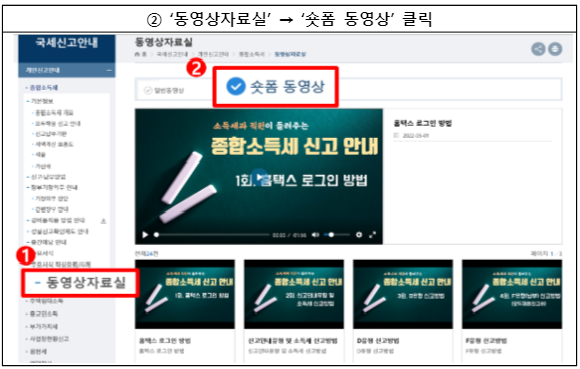 국세청에서는 올해 종합소득세 신고·납부에 불편함이 없도록 총 54편의 숏폼(short form)을 제공하여 복잡하고 어려운 종합소득세 신고 과정을 쉽고 빠르게 마칠 수 있도록 하였습니다.