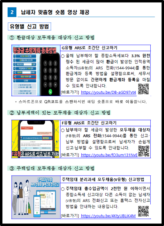 주택임대 총수입금액이 2천만원 이하이고 종합소득세 신고 대상 다른 소득이 없는 납세자(V타입) 영상을 보면 ARS 전화신고와 홈텍스 전자신고 방법을 알 수 있습니다.주택임대분리과세 모두 충족(V타입) 대상자 신고방법 바로가기 과세기간 중 이직한 근로자 신고방법
