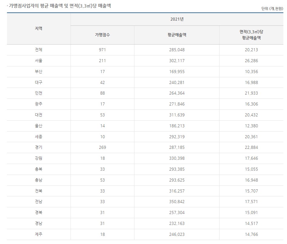 10개 지점 평균 연면적은 13평, 평균 보증금 3000만원, 평균 임대료 216만원, 평균 상여금 1억3600만원, 평균 직원수 5명이었다.