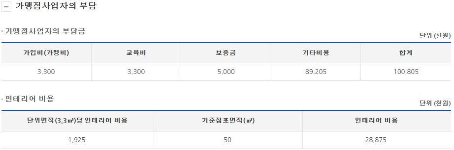 15평 기준이며, 가입비, 교육비, 보증금, 기타 비용 등을 포함해 약 1억원이 소요된다고 볼 수 있다.