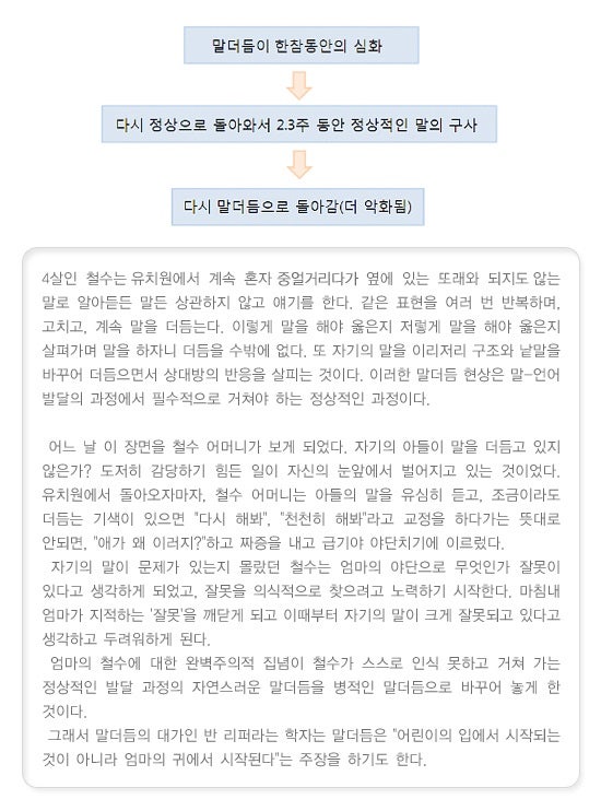 향남 말더듬 3세 이전에 말더듬이 발생하면 어떻게 해야 하는지 알아봅시다. 앞서 언급한 바와 같이 2~4세 아동이 말을 더듬는 것은 매우 흔한 일이며, 이를 발달성 말더듬이라고 합니다. 이는 그들이 전달하고자 했던 생각이 말로 빠르게 표현되지 않고 발달상의 문제가 있었음을 시사한다. 3세 전후 또는 학교 시작 전에도 관찰할 수 있습니다. 이 상태는 일반적으로 치료 없이 저절로 해결됩니다.