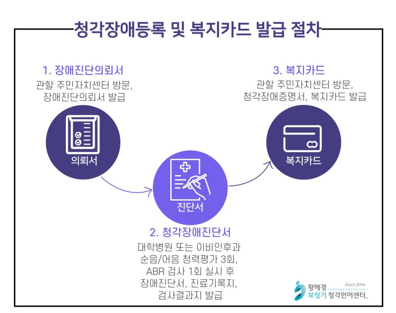 보청기 보조금을 받으려면 청각 장애 진단을 받아야 합니다. 1. 먼저 거주지의 주민센터에 가서 장애진단신청서를 접수합니다. 2. 난청 진단 검사 장비가 구비된 이비인후과에서 순음(PTA) 및 음성(WRS) 청력 검사 3회와 청각 뇌간 유발 반응 검사(ABR) 1회를 실시합니다. 모든 결과가 기준을 충족하면 장애 진단이 발급됩니다. 3. 발급된 청력검사결과 및 장애진단결과를 거주지 주민센터에 제출하여 장애등록심사를 받고 청각장애 판정통지를 받은 후 복지카드를 수령한다. 보조금 신청 절차는 어떻게 진행되나요?