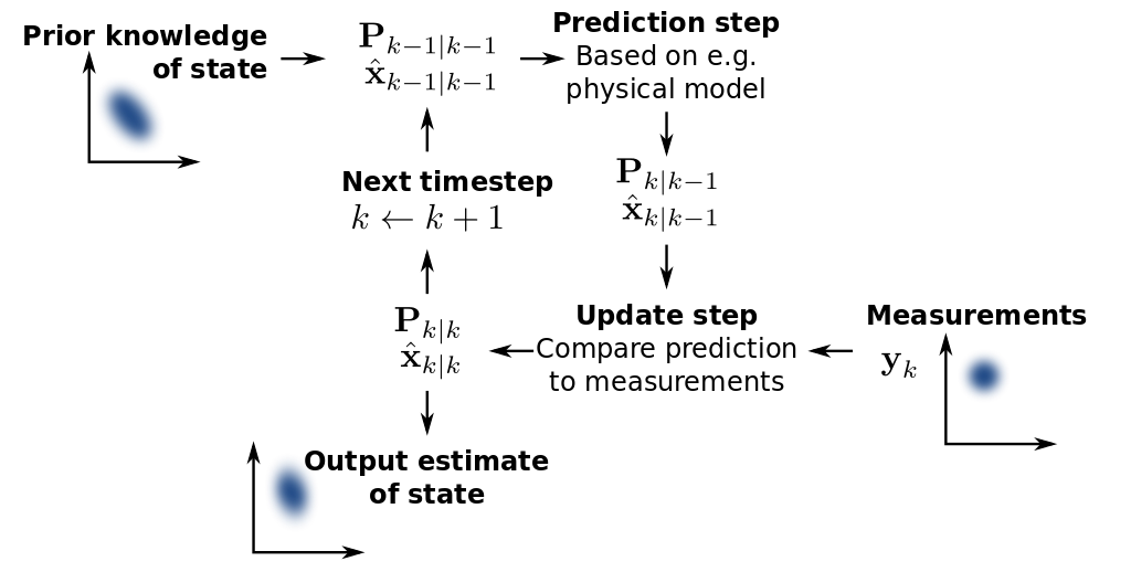 이 경우 Kalman 필터가 사용됩니다. 칼만 필터의 기본 개념은 “과거와 현재 값을 재귀적으로 연산하여 최적의 값을 추적하는 것”입니다. 여기서 필터는 노이즈 값, 즉 측정 데이터에 포함된 불확실성을 필터링하는 데 사용됩니다. 대상에서 얻은 데이터가 완벽하지 않기 때문에 누락된 속성을 채우는 역할을 합니다. 예를 들어 측정 데이터나 신호에는 항상 노이즈가 수반되기 때문에 원하는 신호나 정보를 골라내는 알고리즘 정도로 생각하면 되고, 이를 정규분포 대상에 사용할 수 있다.